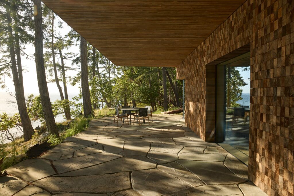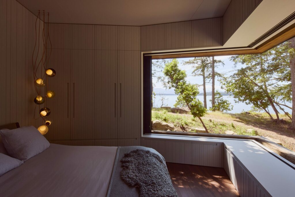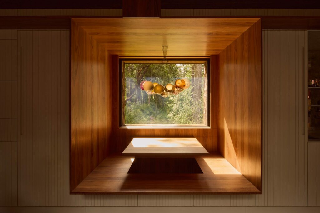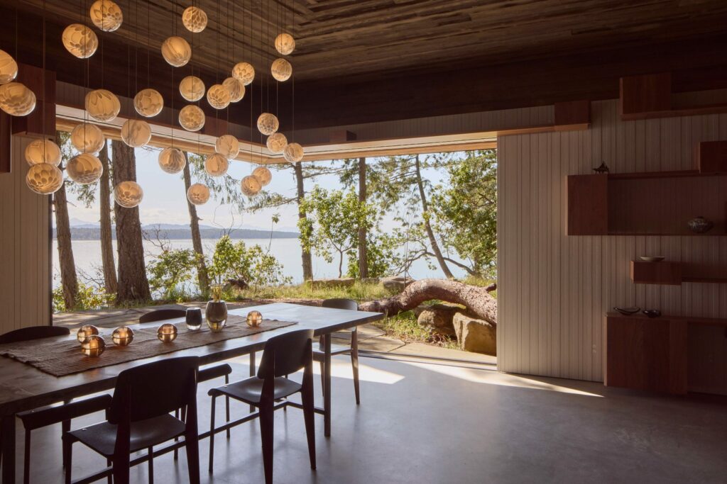 Vật liệu giữ vai trò trung tâm trong trải nghiệm này. Gỗ tuyết tùng được xử lý bằng cách phun cát phần đầu thớ, tạo bề mặt tương phản cao, gợi hình ảnh những chồng gỗ xếp lớp. Theo thời gian và ánh nắng, bề mặt ấy trở nên ngày càng sống động. Nội thất tiếp nối tinh thần đó với trần gỗ tuyết tùng, vách gỗ thanh mảnh, sàn bê tông đánh bóng, một diễn giải đương đại, tiết chế của căn nhà gỗ Bắc Mỹ.
