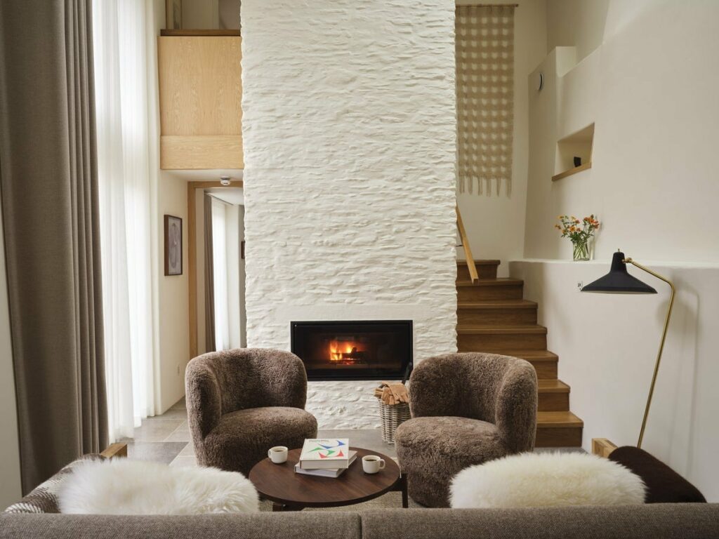 Chỉ với mười suite riêng biệt, ba phòng trong căn farmhouse cổ và bảy phòng nằm rải rác quanh khu đất, Fowlescombe tạo nên cảm giác thân mật hiếm có. Từng không gian được thiết kế bởi Paul Glade cùng đội ngũ kiến trúc sư và nghệ nhân châu Âu, lấy cảm hứng Bắc Âu làm chủ đạo: tường trắng, sàn gỗ mộc, gam màu cát và những chi tiết len cừu mang hơi thở tự nhiên. Sự tinh tế thể hiện trong từng chi tiết nhỏ từ trà lá rời, cà phê xay tươi, nệm lông cừu đến ánh đèn cảm biến dịu nhẹ trong đêm.