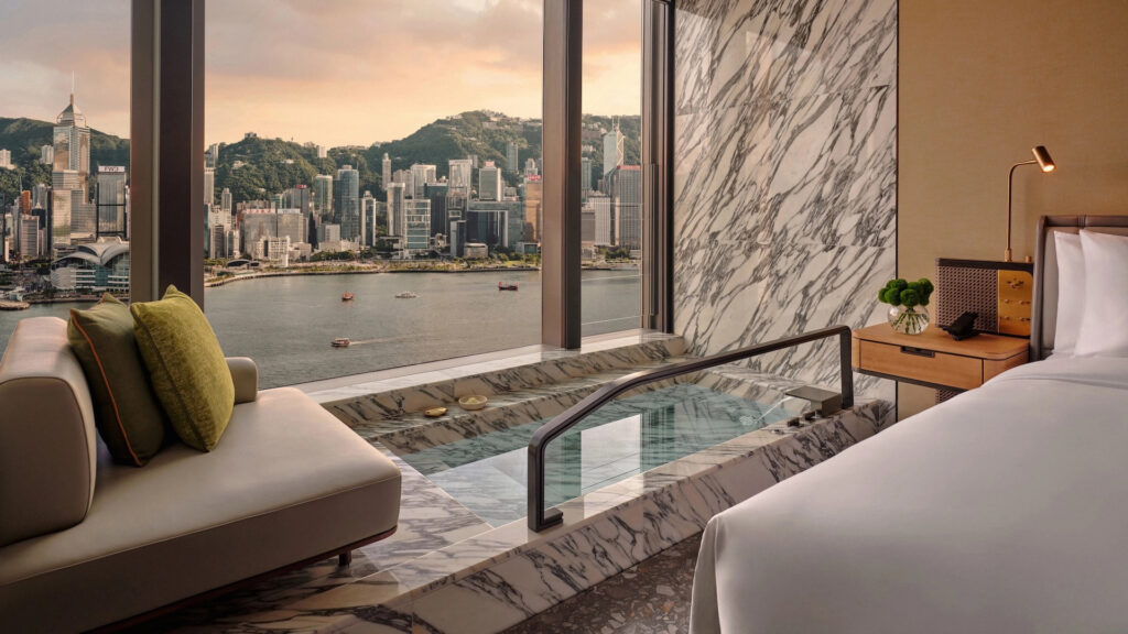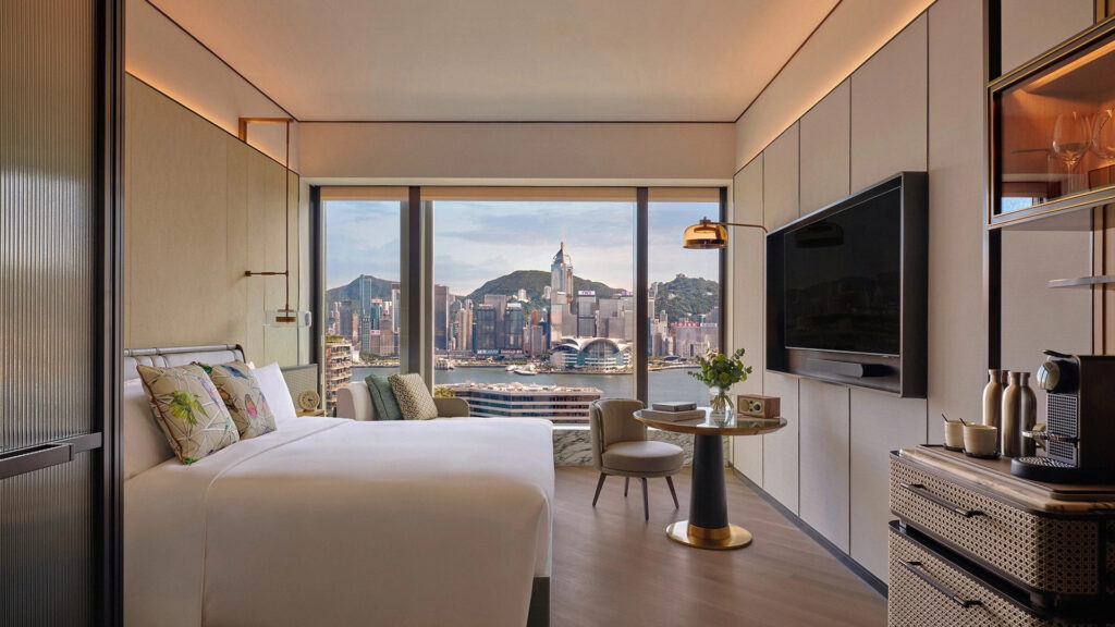iều khiến Kimpton trở nên cuốn hút nằm ở cách công trình đối thoại với ký ức địa phương. Sau lớp mặt dựng kính hiện đại là những chi tiết gợi nhắc quá khứ của bến cảng Hong Kong: tường gạch đỏ như lời tri ân đến Signal Tower, trần kim loại dập nổi mô phỏng làn sóng nhẹ, cùng mặt bằng chữ V giúp mọi phòng nghỉ đều hướng tầm mắt về Victoria Harbour. 495 phòng và suite vì thế không chỉ là không gian lưu trú, mà giống như những khung cảnh riêng tư để ngắm nhìn thành phố bằng một nhịp điệu chậm hơn, tinh tế hơn.