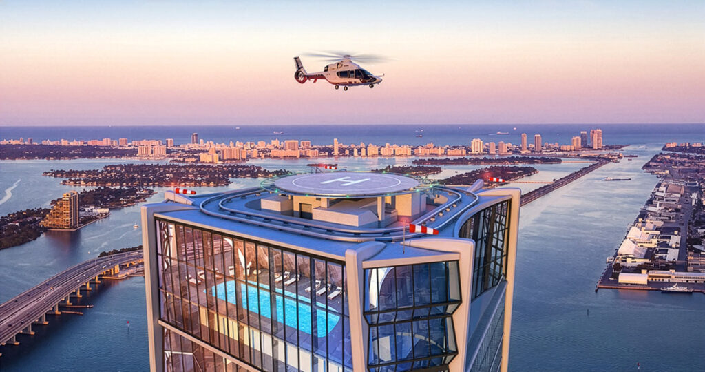 Đến nay, tầm nhìn đó đã mở rộng theo chiều thẳng đứng. Tòa nhà E11even Hotel and Residences với 65 tầng ở Downtown Miami không chỉ sở hữu các spa đẳng cấp hay lounge rooftop sôi động, mà còn tích hợp một bãi đáp trực thăng riêng trên đỉnh phục vụ cho những cư dân thượng lưu không chấp nhận sự chậm trễ. Tương tự, One Thousand Museum của cố kiến trúc sư Zaha Hadid, với bãi đáp trực thăng trên mái, đã thu hút những tên tuổi như David và Victoria Beckham, góp phần đưa chuẩn mực bất động sản Miami bước sang một chương mới.