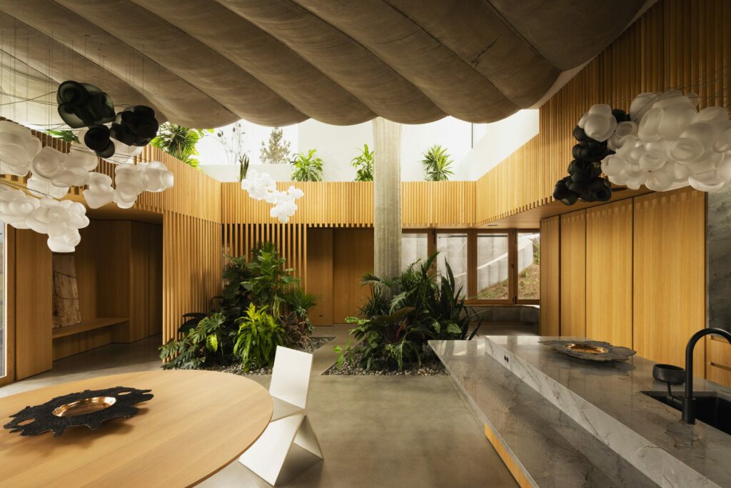 Đặc biệt, những thân cây trưởng thành được trồng ngay trong lõi rỗng của cột, vươn lên xuyên qua mái nhà, xóa nhòa ranh giới giữa công trình và tự nhiên. 75.9 House không tìm cách nổi bật, mà lặng lẽ tồn tại như một phần của địa hình nơi bê tông, nhờ vải và thời gian, học cách chảy, thở và già đi cùng cảnh quan.