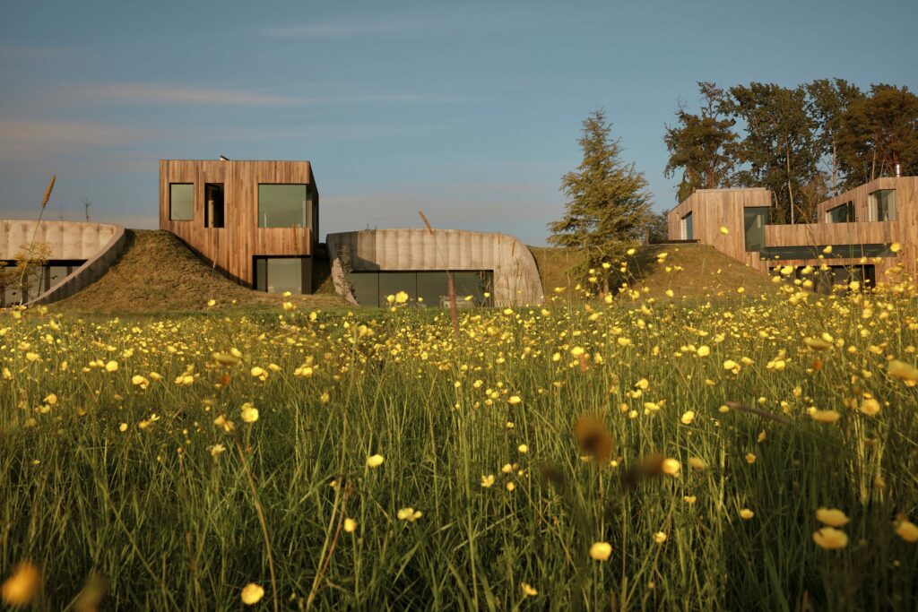 Thay vì xem các cột như yếu tố kết cấu thuần túy, nhóm thiết kế tiếp cận chúng như những “tàn tích khảo cổ” được phát hiện giữa cánh đồng cỏ khô. Các khối nhà ốp gỗ hình chữ nhật được xây dựng xen kẽ và bao quanh những trụ bê tông này, trong khi các ụ đất phủ lên mái khiến toàn bộ công trình như được kéo lên từ chính mặt đất.