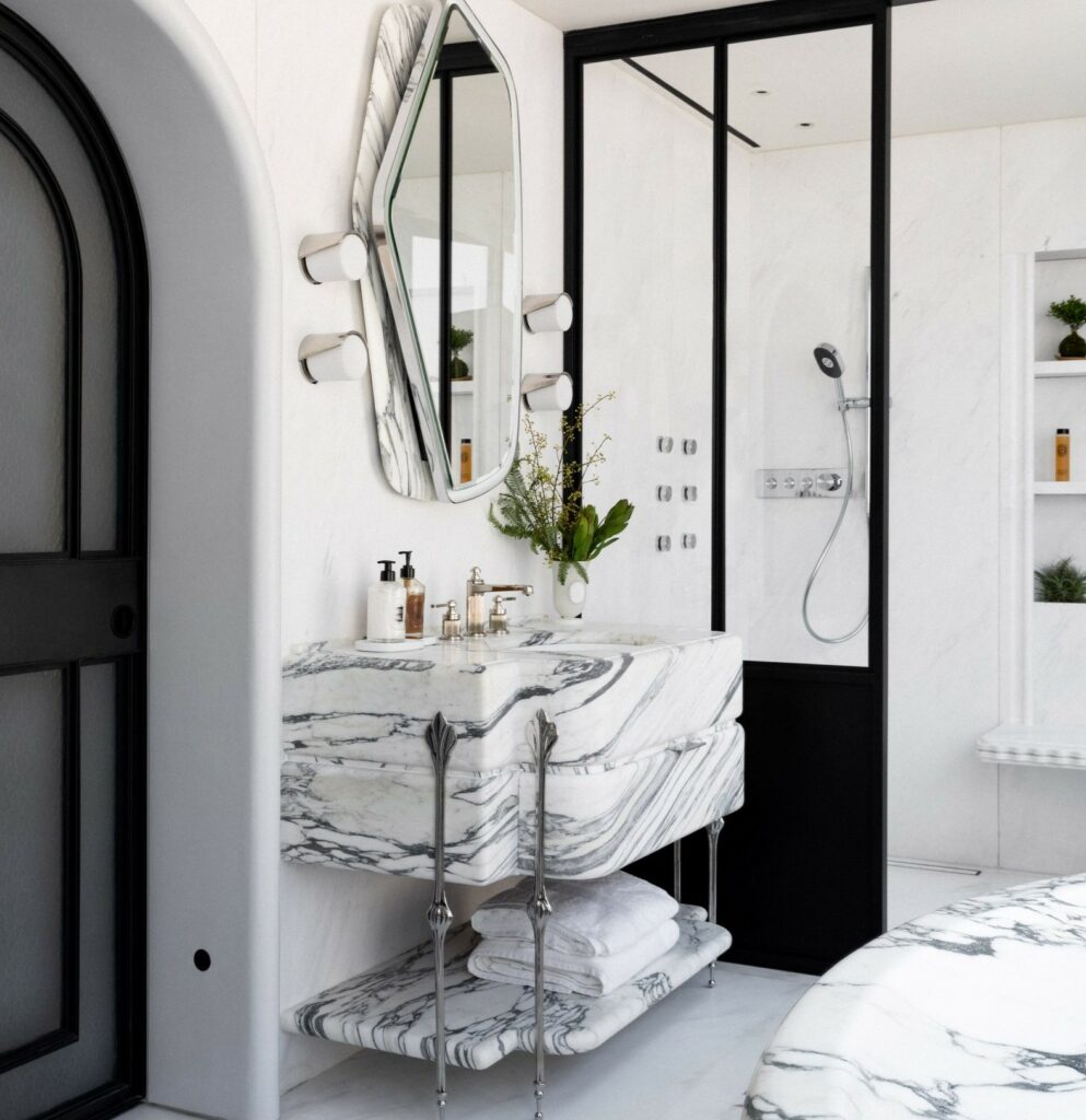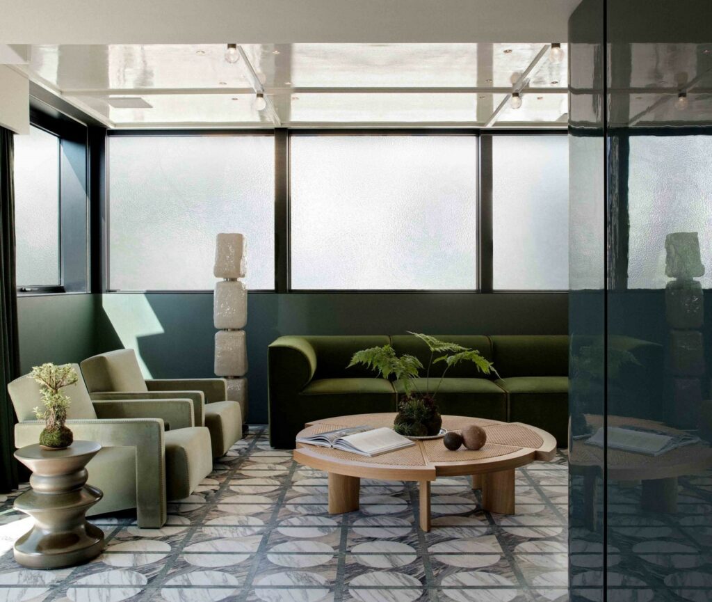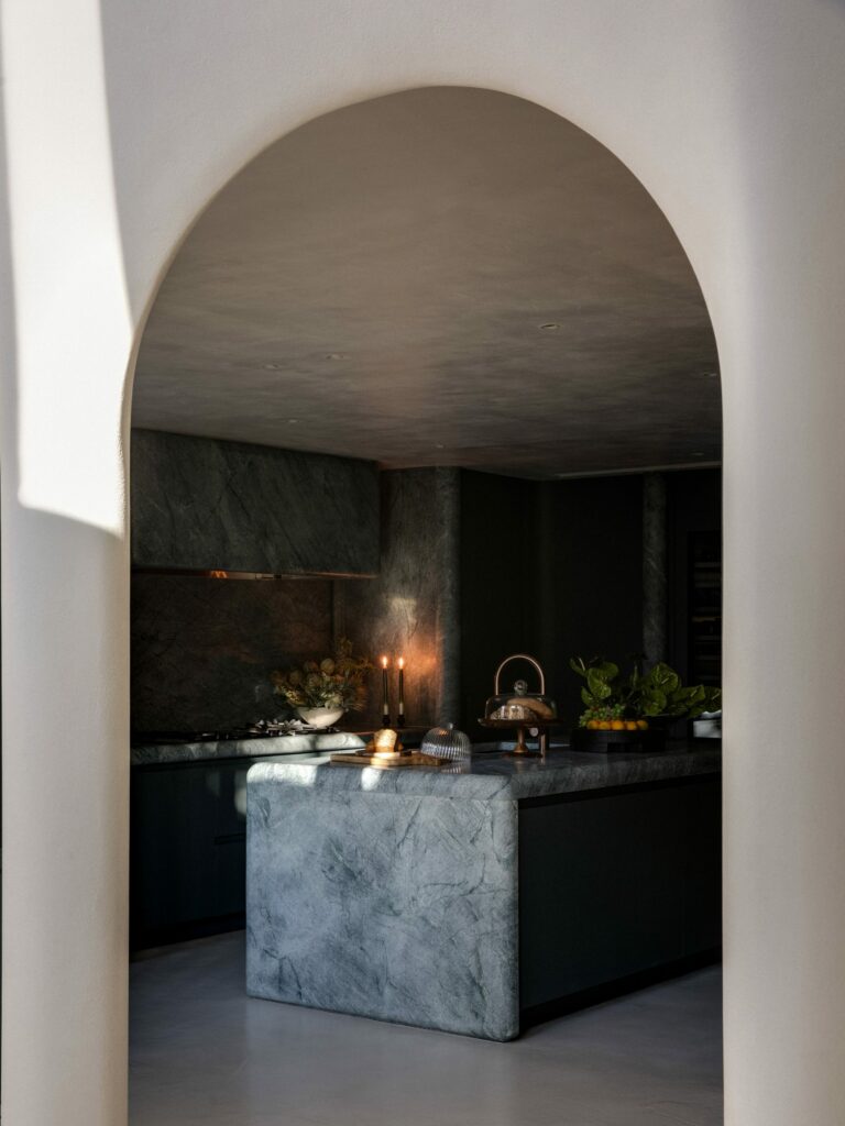 Chất liệu được tiết chế nhưng giàu chiều sâu: đá cẩm thạch, đá vôi trầm tích và bề mặt trát trắng tạo nên bảng màu trung tính, mang hơi thở thiền định. Gian bếp tối màu nổi bật với đảo bếp như bàn thờ, chế tác từ đá Tinos. Phòng ăn tầng hai đặt bàn đá vôi trầm tích thiết kế riêng, phía trên là một thánh giá điêu khắc được chiếu sáng tinh tế.
