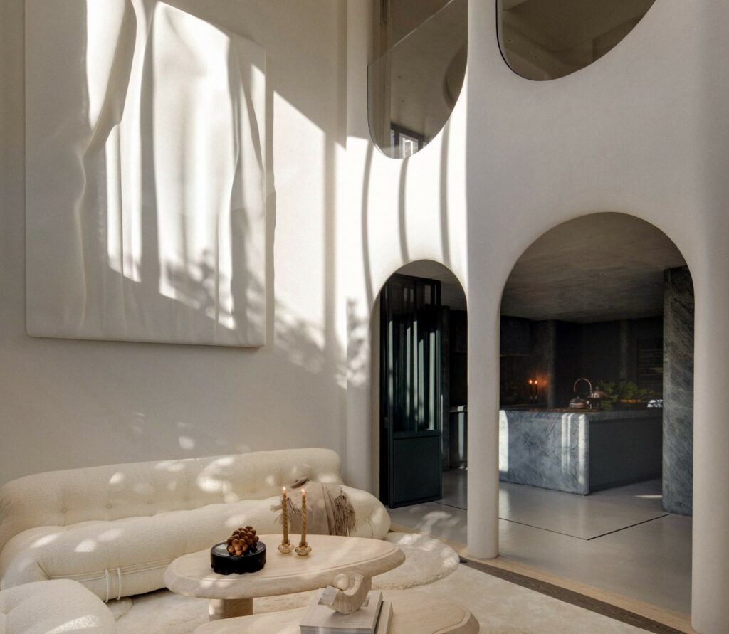ông trình rộng 418 m², trải dài trên sáu tầng, được thiết kế cho một cặp vợ chồng theo đạo Thiên Chúa cùng các con. Không gian sinh hoạt, bếp và phòng ăn liên kết bằng chuỗi vòm cong xếp chồng và đảo chiều, gợi nhớ hành lang tu viện châu Âu, tạo nên nhịp điệu kiến trúc mang tính dẫn dắt và chiêm nghiệm. Ánh sáng tự nhiên đóng vai trò trung tâm, xuyên qua các khoảng vòm, làm mềm cấu trúc và mang lại cảm giác thiêng liêng.