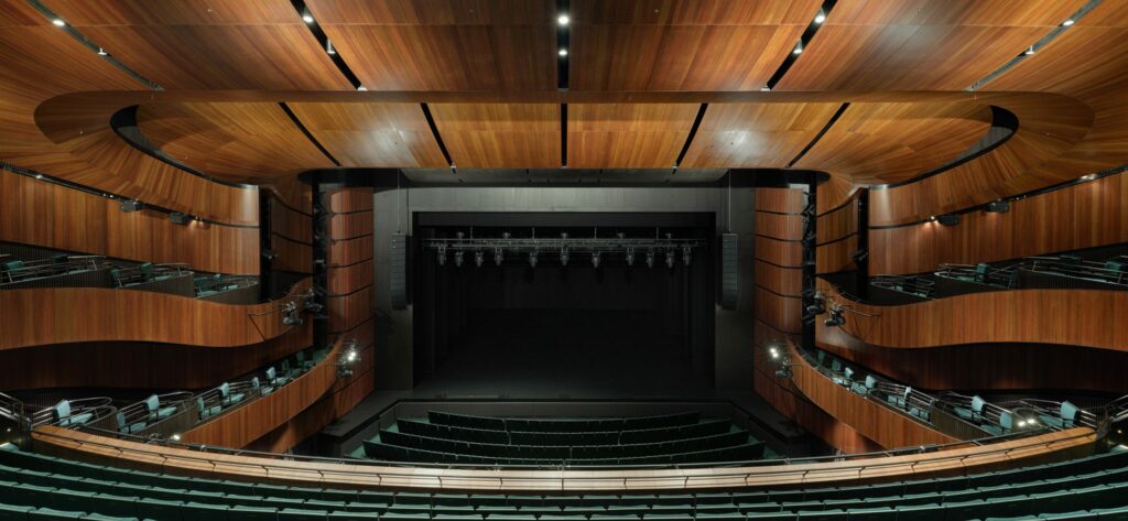 Nếu sảnh là phần mở của ánh sáng và thị giác, khán phòng lại đi theo hướng ngược lại. Không gian biểu diễn được xử lý tối, sâu và nén hơn, với tường grey ironbark, thảm xanh đậm và một bầu không khí có chủ ý tách khỏi sự sáng thoáng phía ngoài. Khoảng cách từ sân khấu đến hàng ghế xa nhất chỉ 28 mét khiến nhà hát giữ được độ gần gũi hiếm thấy ở một venue quy mô lớn, nơi trải nghiệm của khán giả và nghệ sĩ được đưa về cùng một quỹ đạo cảm xúc.