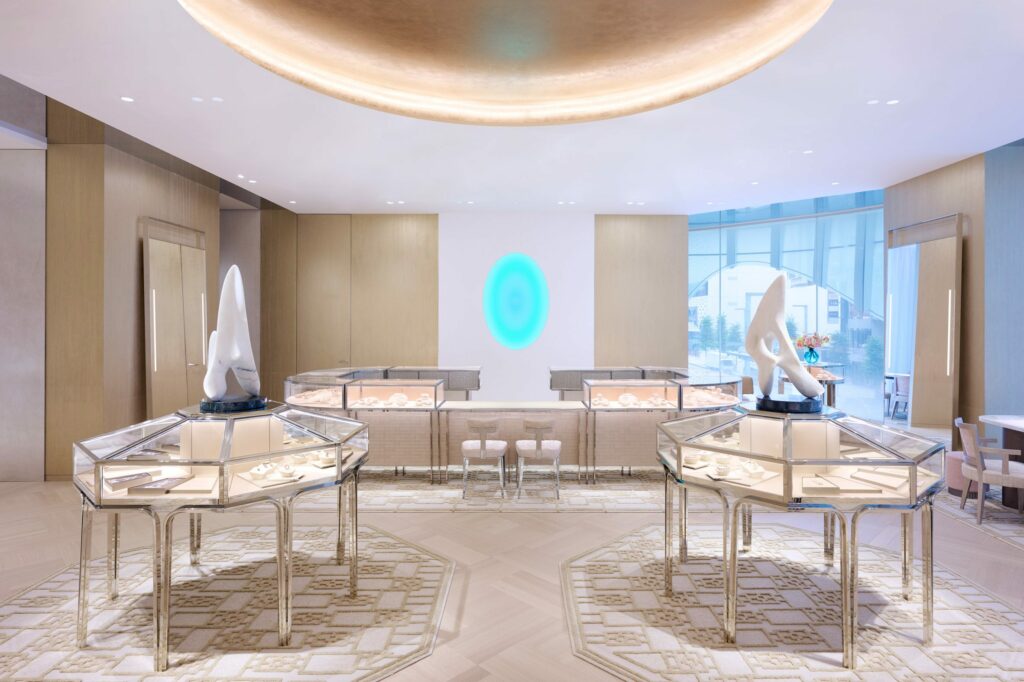 Bên trong, Tiffany & Co trải dài bốn tầng được bao bọc bởi rèm sheer nhẹ nhàng.