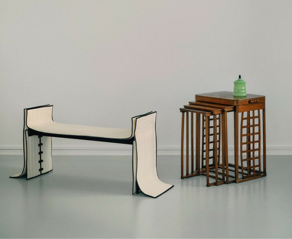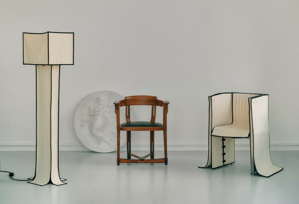 hay vì sử dụng lớp bọc mềm đồ nội thất theo phương pháp truyền thống — kéo căng, cố định vải lên khung cứng — Ryom lựa chọn một hướng đi mềm mại hơn. Các thiết kế của cô được “may đo” như trang phục, ôm lấy cấu trúc kim loại mà vẫn giữ được độ rủ tự nhiên của chất liệu. Chính sự tự do này mang lại cảm giác sống động, nơi vải không còn là lớp phủ mà trở thành một phần ngôn ngữ thiết kế.