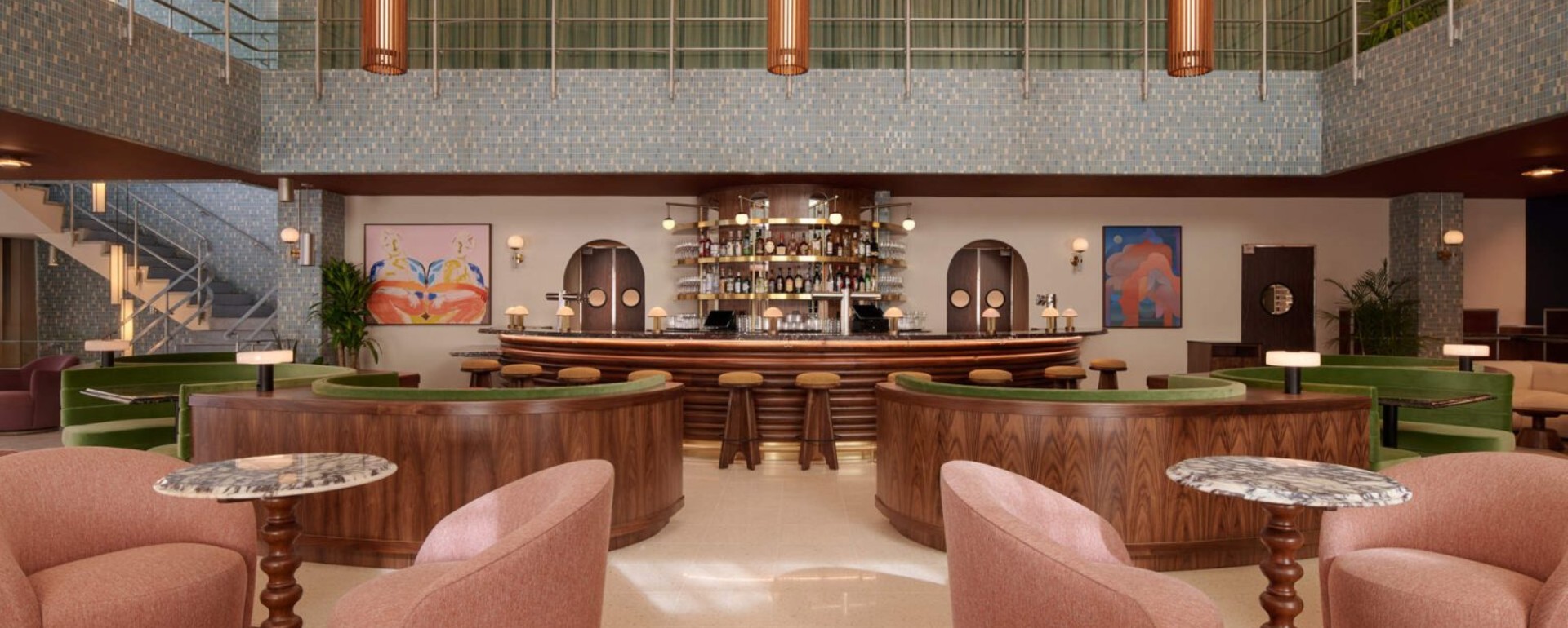 Tầng trệt mở ra một không gian sảnh cao hai tầng, nơi quầy bar hình bán nguyệt trở thành “trái tim xã hội” của khách sạn. Đây là nơi khách lưu trú và người dân địa phương gặp gỡ, trò chuyện và lưu lại lâu hơn dự định. Ánh sáng mid-century nguyên bản, gạch mosaic xanh và hệ ghế bo tròn tạo nên một không gian vừa hoài niệm vừa sống động.