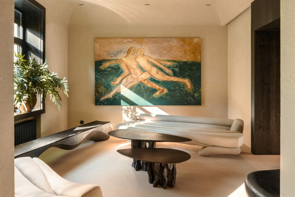 Không gian lễ tân mang tính điêu khắc rõ nét với bàn đá quartzite vân gỗ, ghế gỗ óc chó của Tetiana Krasutska và các tác phẩm gốm từ nhiều nghệ sĩ đương đại. Phòng tắm ở cuối hành lang gây ấn tượng với mảng tường gốm tạo hình giọt nước, đồng thời loại bỏ gương để khuyến khích sự tĩnh tâm – một chi tiết nhỏ nhưng giàu tính triết lý.