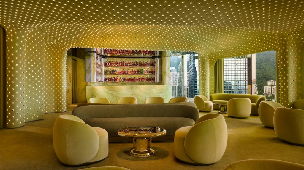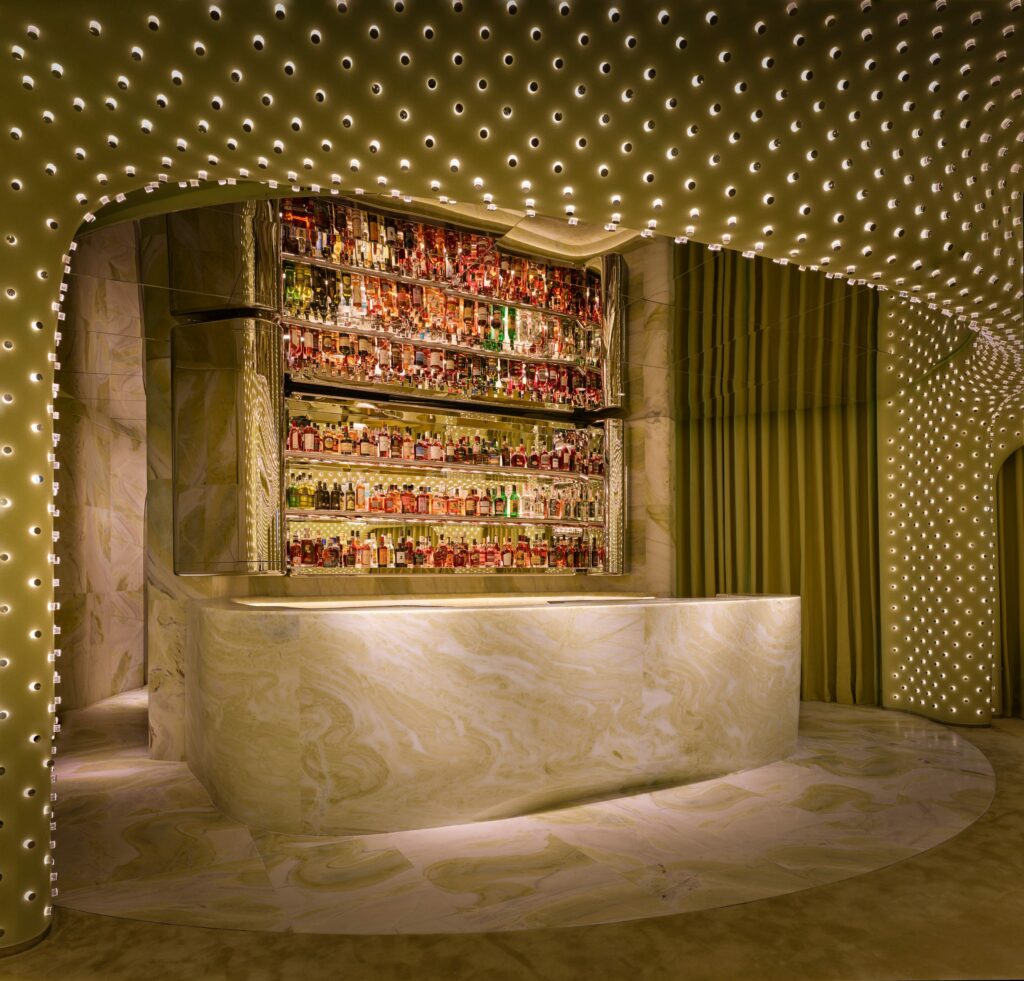 ược thiết kế bởi Studio Paolo Ferrari, không gian bar này gần như được bao phủ hoàn toàn bởi sắc xanh lime, tạo nên một lớp vỏ kén (cocoon) ôm trọn cảm xúc người bước vào. Hơn 20.000 điểm sáng li ti xuyên qua các trụ acrylic mờ, phủ kín tường và trần cong liên tục, khiến không gian như đang giãn nở vô tận, gợi nhớ một quả cầu disco bị “phân rã” thành những pixel ánh sáng.