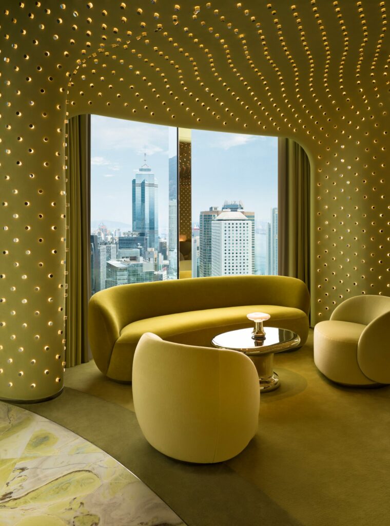 Ẩn sau lớp không gian chính là một lounge riêng tư, dẫn lối qua hành lang marble uốn cong. Tại đây, khi không còn cửa sổ, ánh sáng trở nên dày đặc hơn, bao trùm toàn bộ trải nghiệm, phản chiếu lên những bề mặt chrome và đồ nội thất mềm mại, tạo nên cảm giác vừa siêu thực vừa thân mật.