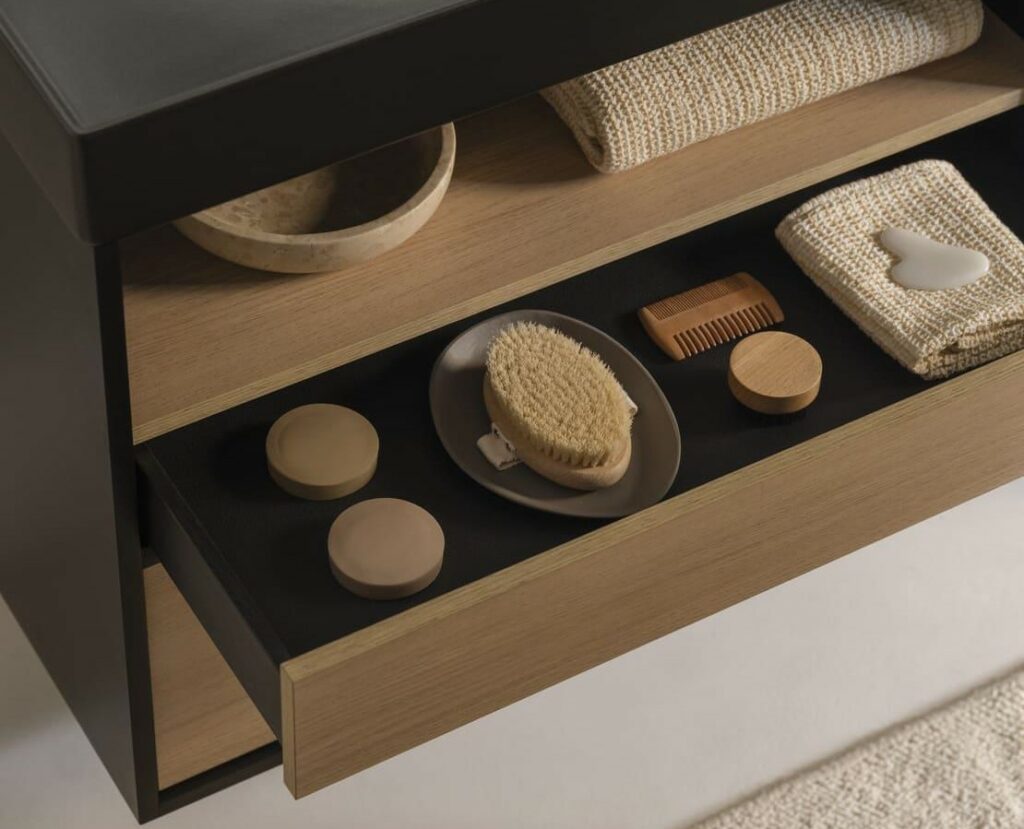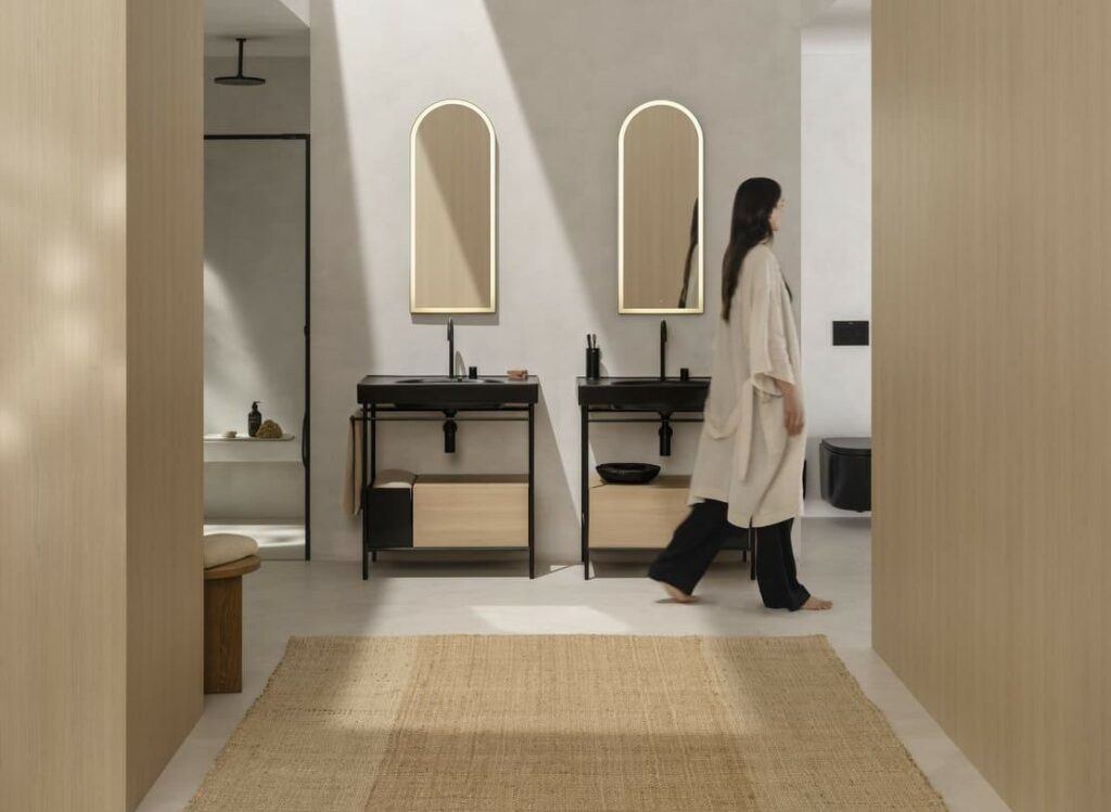 Meridian còn mở rộng trải nghiệm với các mẫu lavabo đặt trên khung thép kết hợp tủ gỗ tự nhiên đạt chứng nhận FSC. Những hộc kim loại và ngăn kéo được bố trí kín đáo, mang lại giải pháp lưu trữ tinh gọn cho khăn tắm và phụ kiện, đồng thời giữ cho tổng thể không gian luôn gọn gàng, thư thái. Đáng chú ý là các mẫu chậu rửa bất đối xứng, chế tác từ vật liệu gốm độc quyền của Roca, tạo điểm nhấn thị giác nhẹ nhàng nhưng khác biệt.