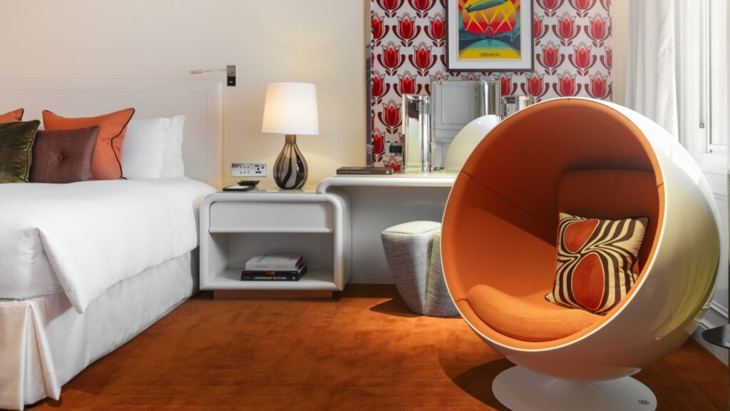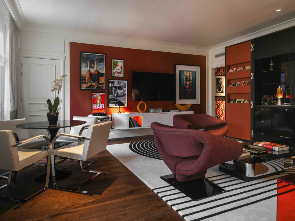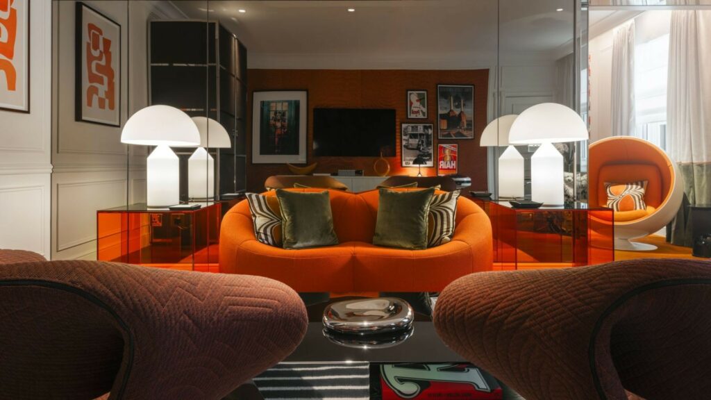 Tại Sofitel London St James, Suite 70 mở ra như một tuyên ngôn táo bạo giữa thế giới khách sạn xa xỉ vốn chuộng sự tiết chế. Không chọn cách kể chuyện bằng những gam màu trung tính quen thuộc, không gian này đắm mình trong sắc cam rực rỡ, tái hiện tinh thần phóng khoáng và đầy năng lượng của thập niên 1970.