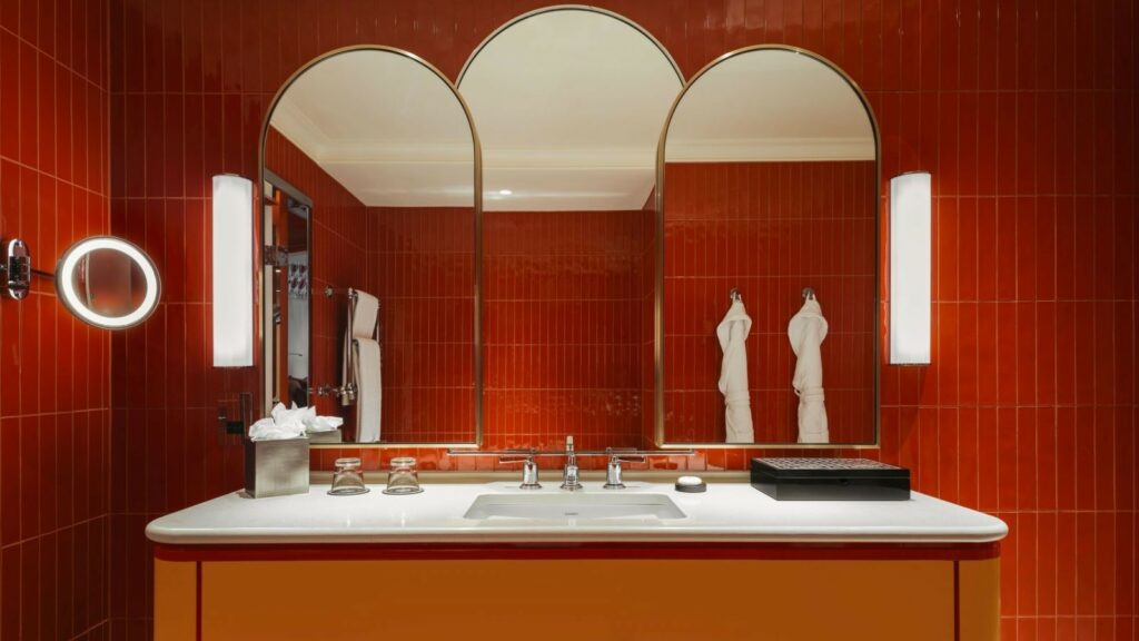 Phòng tắm là điểm nhấn đầy cá tính, với gạch men bóng và chi tiết thiết kế bespoke, mang lại cảm giác vui tươi gần như trẻ thơ. Trong bối cảnh phần lớn khách sạn hiện đại theo đuổi bảng màu “an toàn”, Suite 70 lại chọn cách đối lập hoàn toàn, tạo nên một trải nghiệm khó quên.