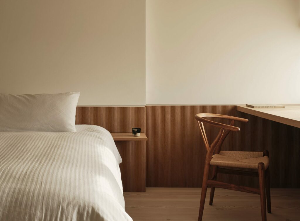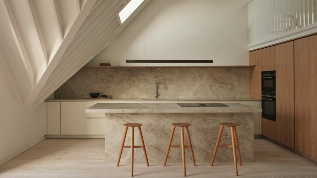 Bảng màu được tiết chế tối đa. Trần dầm và sàn gỗ Douglas fir phủ dầu trắng nhằm nhấn mạnh hình học mái, giữ cho tổng thể nhẹ và thanh thoát. Gỗ sồi lộ vân, gỗ sẫm màu tại phòng ngủ và đá Taj Mahal Quartzite nơi bếp tạo nên những điểm nhấn trầm ấm.