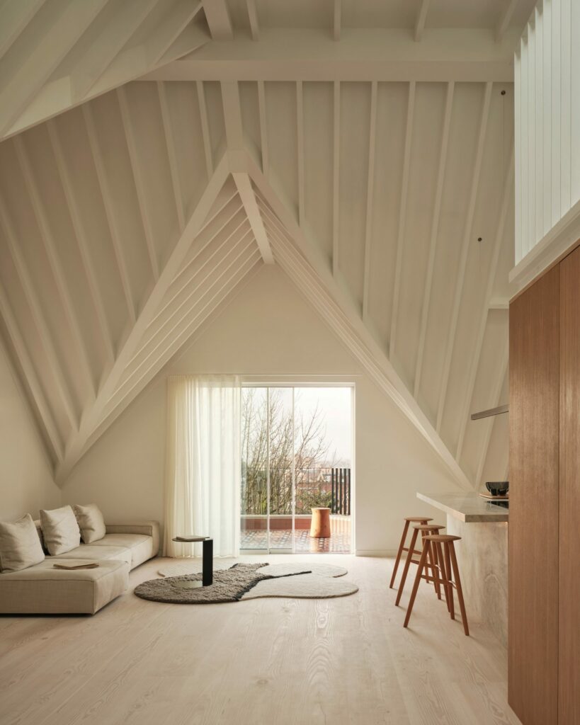 ận dụng “thung lũng” giữa hai mái nhà song song của các công trình liền kề, nhóm thiết kế hợp tác cùng Float Structures để tạo nên một hệ mái mới cao tối đa 4,8 mét. Nhìn từ bên ngoài, phần mái này vẫn nằm gọn trong đường viền hiện hữu của tòa nhà. Nhưng bên trong, nó mở ra một không gian vút cao như thánh đường, nơi trần gỗ uốn lượn tạo nên nhịp điệu lên xuống đầy kịch tính.