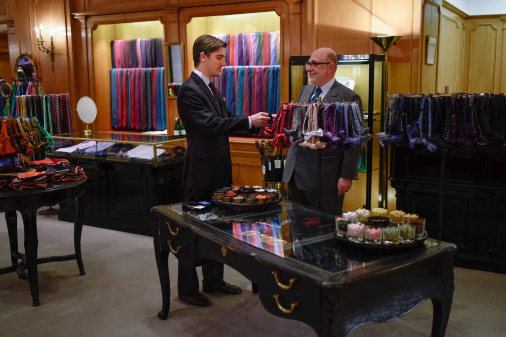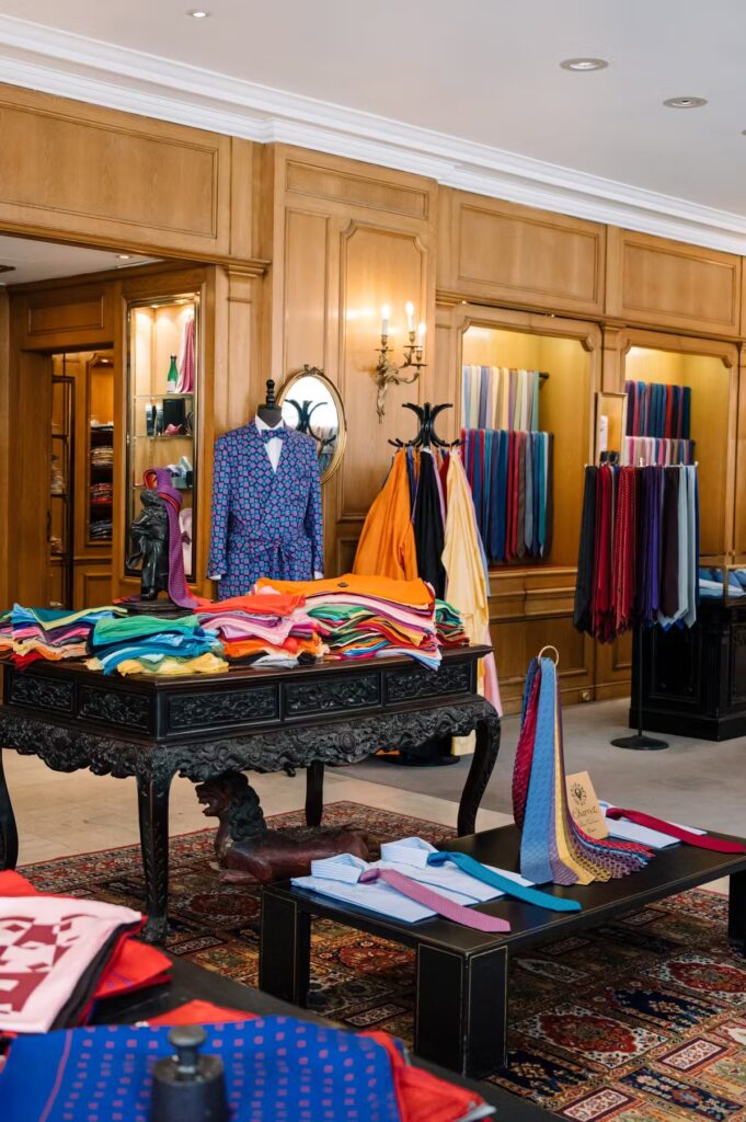 Cửa hiệu là một phòng trưng bày rực rỡ. Trên kệ gỗ sơn đen, cà vạt lụa, khăn quàng, nơ và khuy măng sét bày biện như kho báu sắc màu. Những đôi tất cashmere và lụa xếp lớp; đôi dép lười da lộn mang tính biểu tượng nay trở thành món đồ yêu thích của thế hệ trẻ phong cách dưới 30, thường xuyên xuất hiện trên Instagram.