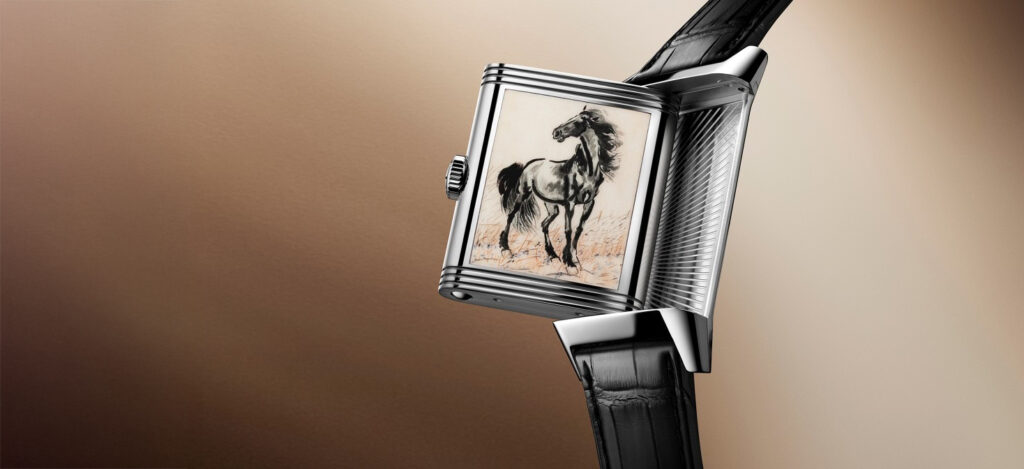 Reverso, chiếc đồng hồ xoay mặt, lần này hóa thành khung tranh. JLC tái hiện ngựa trong tranh Từ Bi Hồng bằng men tiểu họa với 80 giờ công cho mỗi mặt số. Ba phiên bản Running Horse, Two Horses, Standing Horse, mỗi bản giới hạn 10 chiếc. Mặt trước phủ men Grand Feu guilloché. Đây không chỉ là đồng hồ, mà là cuộc đối thoại Đông & Tây.