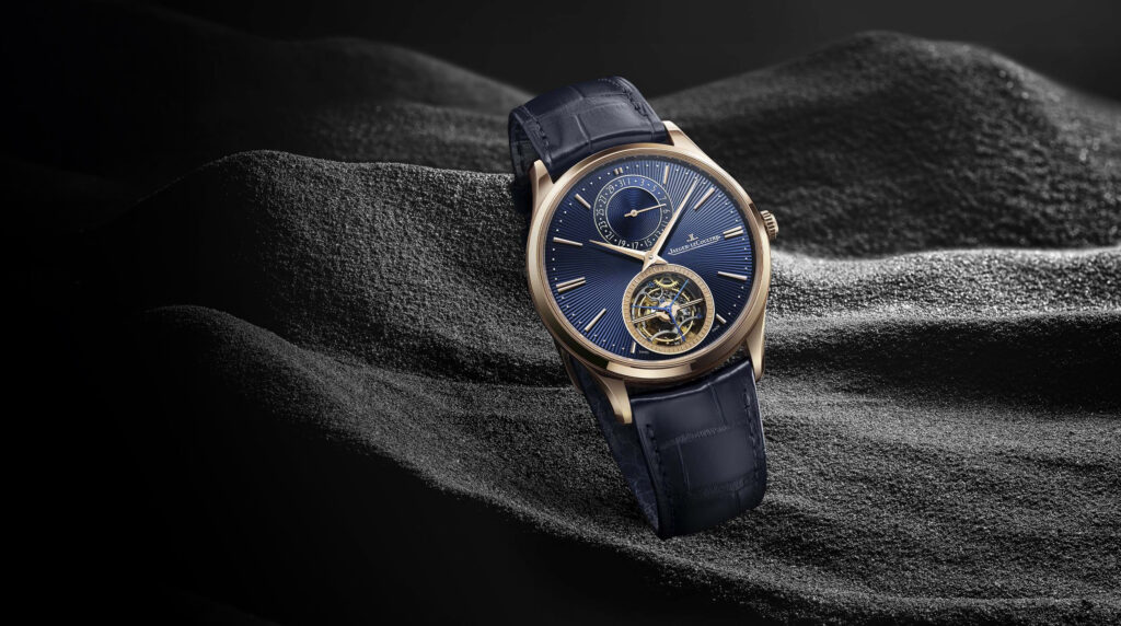 Thanh lịch tuyệt đối, không ai qua được Master Ultra Thin Tourbillon Enamel. Mặt số anthracite có đến 5 lớp men Grand Feu trên nền guilloché chai tia. Lịch ngày phụ ở 12 giờ cân đối cùng tourbillon Calibre 978 ở vị trí 6 giờ, như hai cực âm dương. Vỏ vàng hồng 40 mm, giới hạn 50 chiếc.