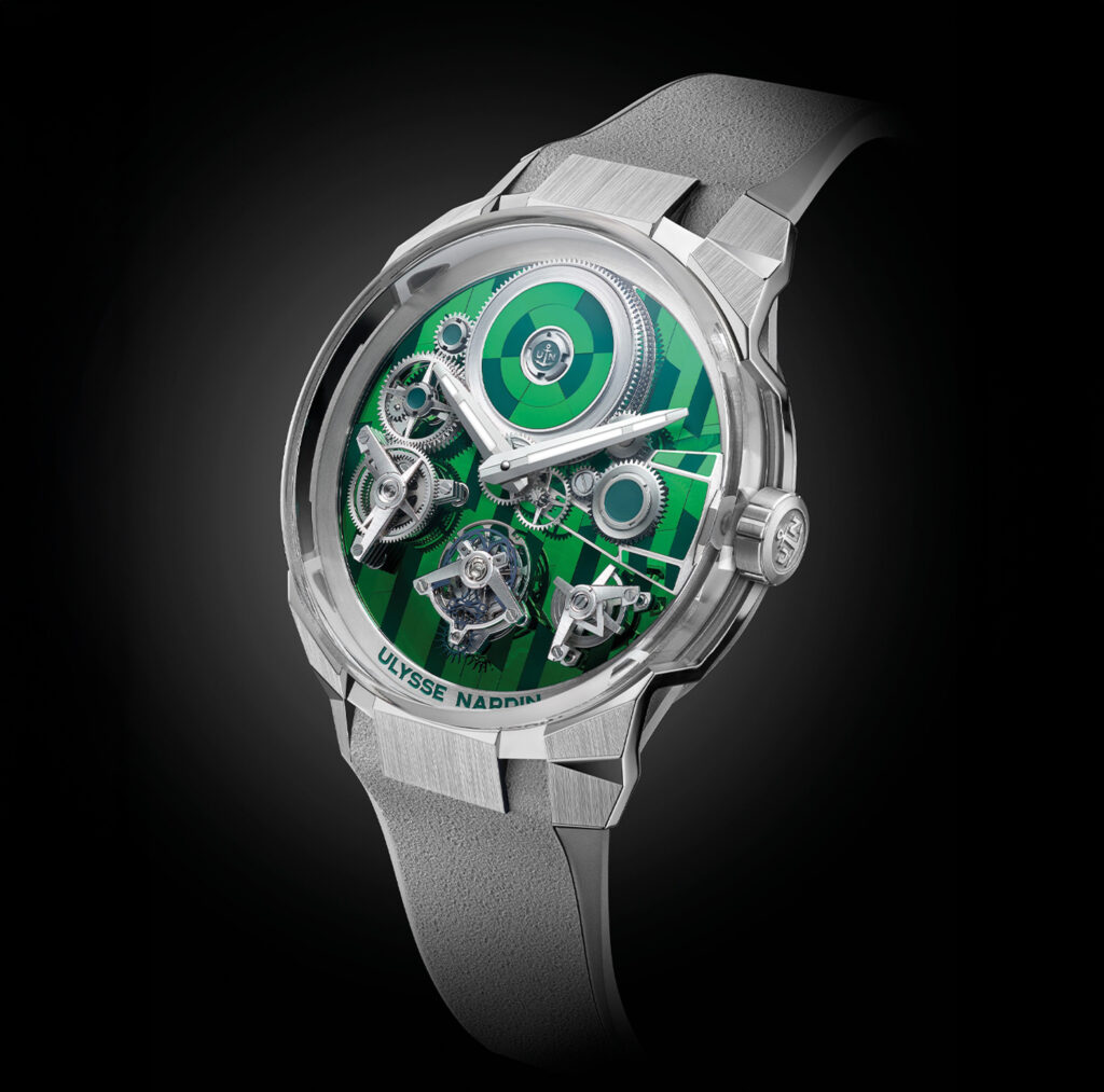 Là người tiên phong cho chất liệu silicon, mùa này hãng đã mang đến Blast Free Wheel Marquetry Silicon Green, một mê cung ánh sáng và công nghệ. Trên mặt số 45 mm, 103 mảnh silicon cắt laser ghép thành hoa văn marquetry xanh lục, lấp lánh như bảng mạch điện tử. Tourbillon bay UN-176 xuất hiện như hành tinh treo lơ lửng, với bánh xe gai, bộ neo, dây tóc đều từ silicon. Toàn bộ bộ máy phô bày ngay trên mặt số, biến đồng hồ thành một tác phẩm điêu khắc cybernetic. Giới hạn 10 chiếc độc quyền, đây là món bảo vật dành cho những tâm hồn say mê tương lai.