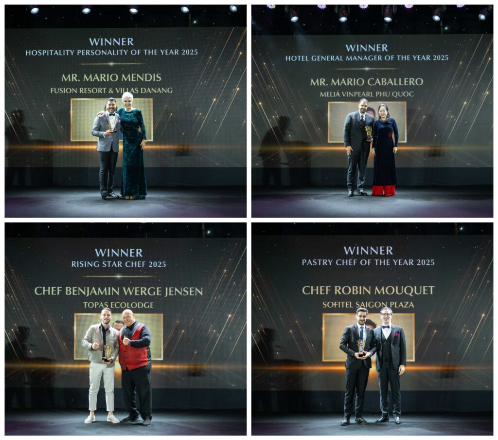 Gourmet Vietnam Awards 2025 cũng dành sự trân trọng đặc biệt cho những cá nhân tạo nên giá trị dài lâu cho ngành. Ông Mario Mendis, Tổng Quản lý Fusion Resort & Villas Danang, được trao danh hiệu Nhân vật Khách sạn của Năm 2025 nhờ tầm nhìn lãnh đạo và cam kết trải nghiệm khách hàng xuất sắc. Ông Mario Caballero của Meliá Vinpearl Phu Quoc được vinh danh Tổng Quản lý Khách sạn của Năm, như một minh chứng cho năng lực vận hành xuất sắc trong toàn bộ hệ thống mà ông dẫn dắt.