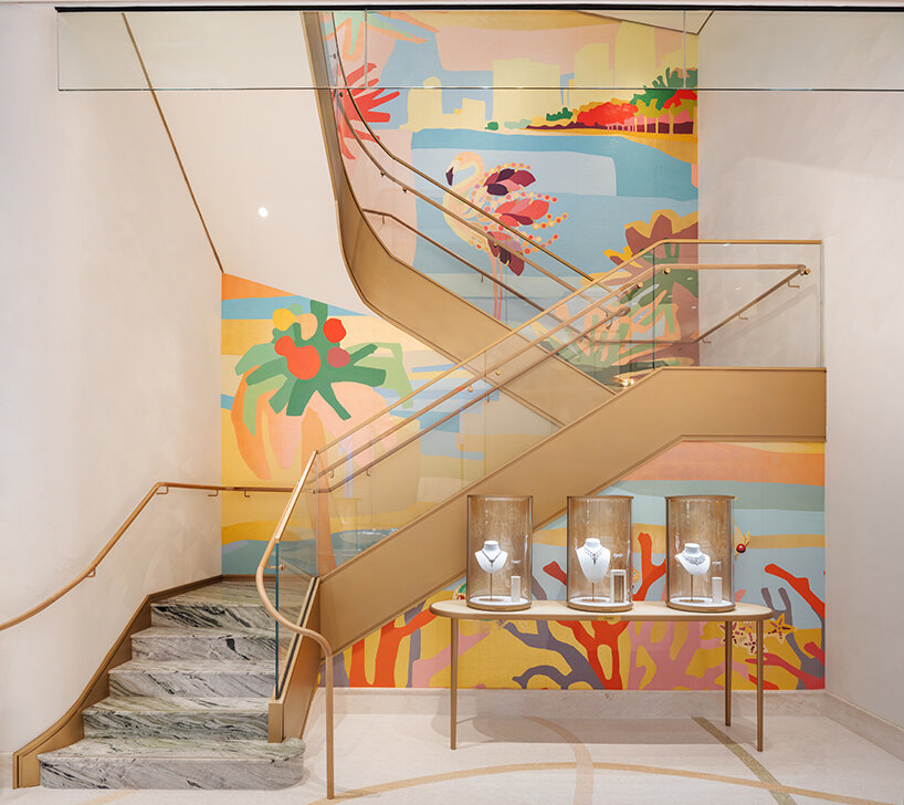 Bước vào bên trong, nhà thiết kế Laura Gonzalez đã thổi hồn vào không gian bằng cảm hứng từ thiên nhiên nhiệt đới của Miami, ánh nắng, cây cọ và sắc biển xanh. Mỗi tầng là một cung bậc cảm xúc khác nhau: sôi động ở khu trưng bày, riêng tư trong phòng VIP, và nên thơ trên cầu thang xoắn vỏ sò dẫn lên khu vườn sân thượng ngập tràn ánh sáng.